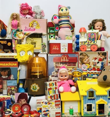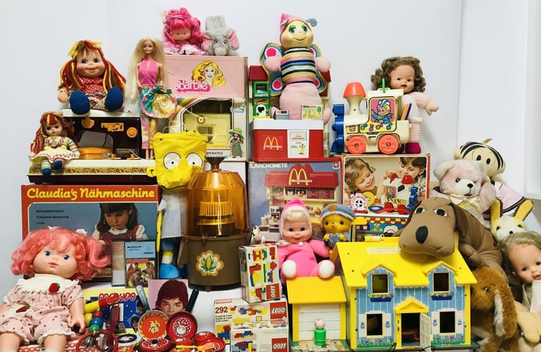 Brinquedos Clássicos de Metal, Madeira ou Plástico dos anos 60, 70 e 80 (Bonecos de Ação, Carrinhos, Blocos).
